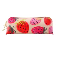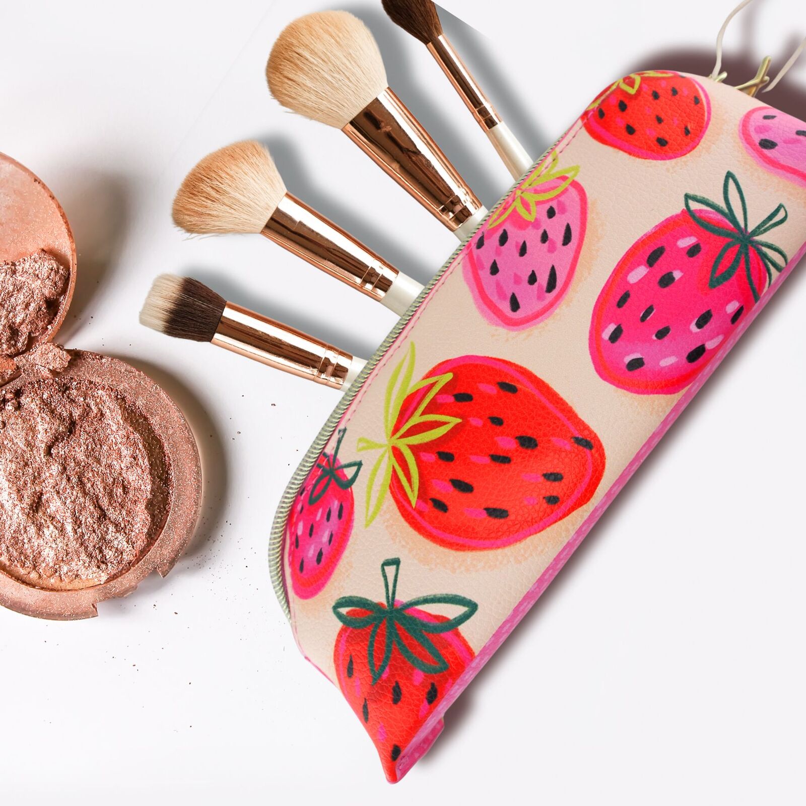 Cosmetic brush bag featuring an array of juicy red and pink strawberries sitting proudly upon a soft, comforting peach base.