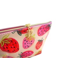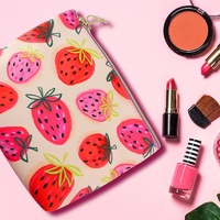 Cosmetic travel bag featuring an array of juicy red and pink strawberries sitting proudly upon a soft, comforting peach base.