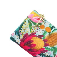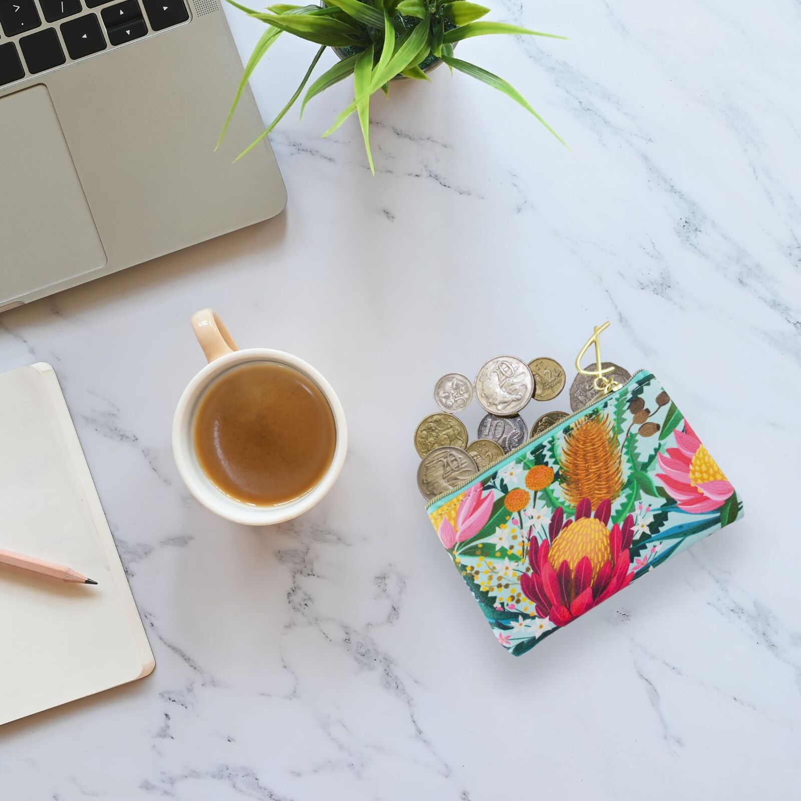 Coin purse showcasing striking proteas, golden banksias and other native Australian flora on a beautiful soft blue base.