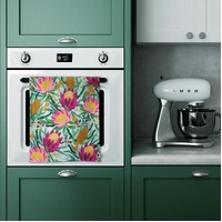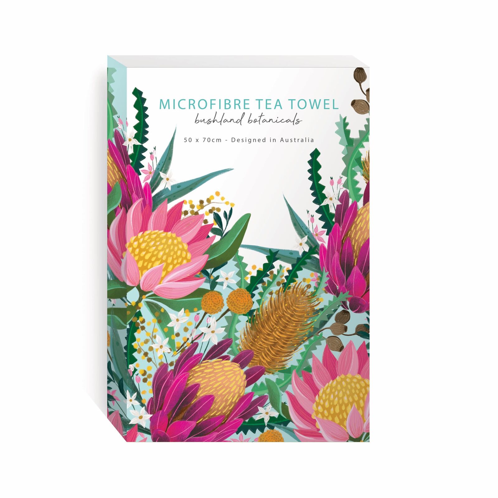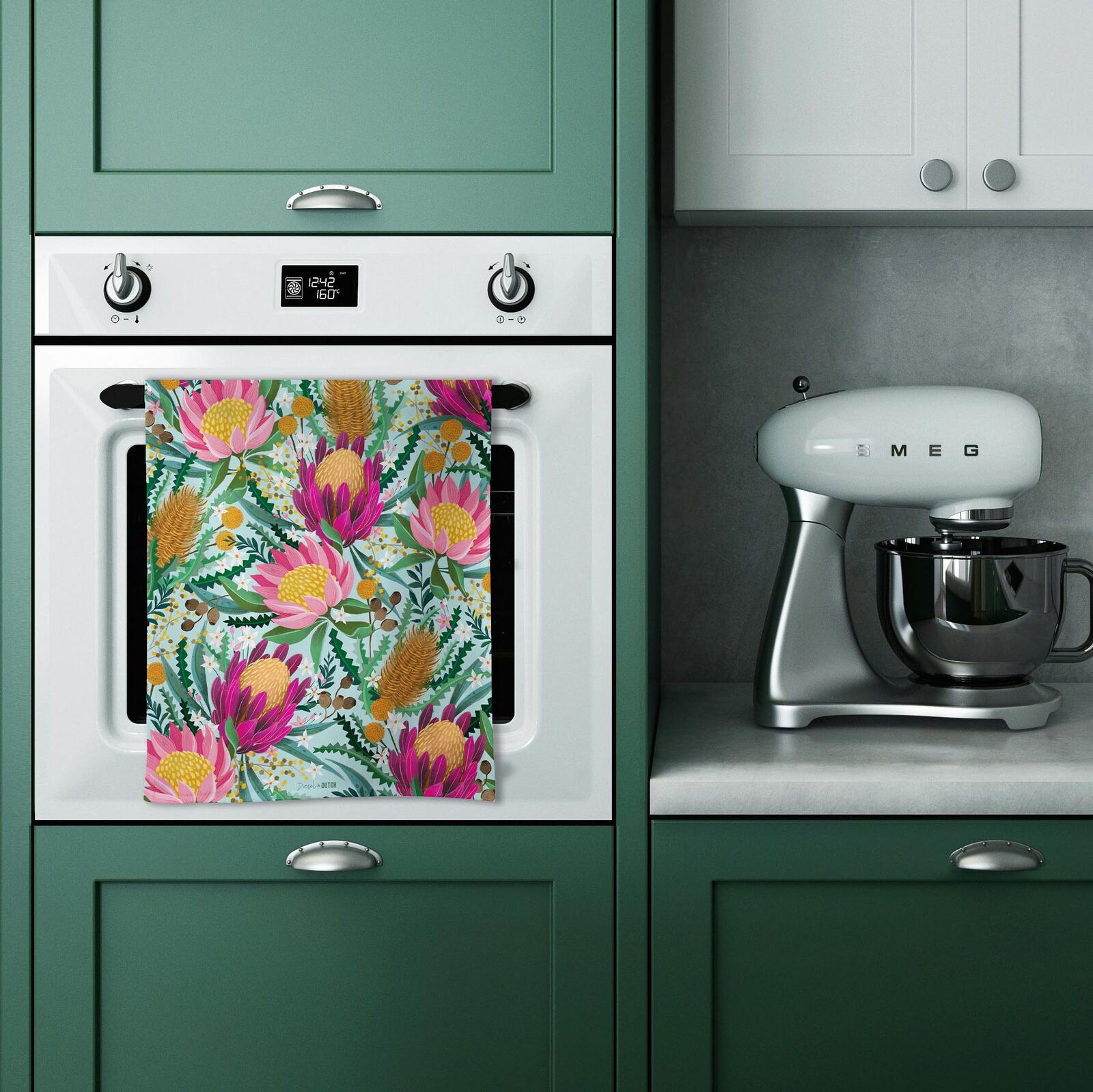 Microfibre tea towel showcasing striking proteas, golden banksias and other native Australian flora on a beautiful soft blue base.