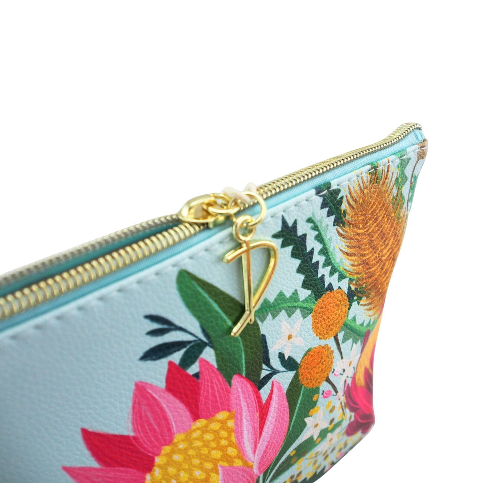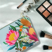 Cosmetic travel bag showcasing striking proteas, golden banksias and other native Australian flora on a beautiful soft blue base.