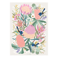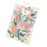 This elegant puzzle showcases a lush arrangement of native blooms in soft pinks and greens, with delicate blue wrens nestled among the flowers. Its gentle palette and intricate botanical details create a calming and beautifully balanced scene, perfect for nature lovers and puzzle enthusiasts alike.